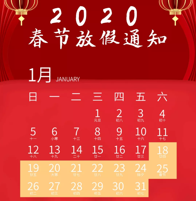 2020年1月18日~2020年2月1日為期14天春節長假。